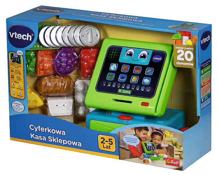 - Posiada 20 elementów, które uczą poprzez zabawę: monety, banknoty oraz imitacje artykułów spożywczych.