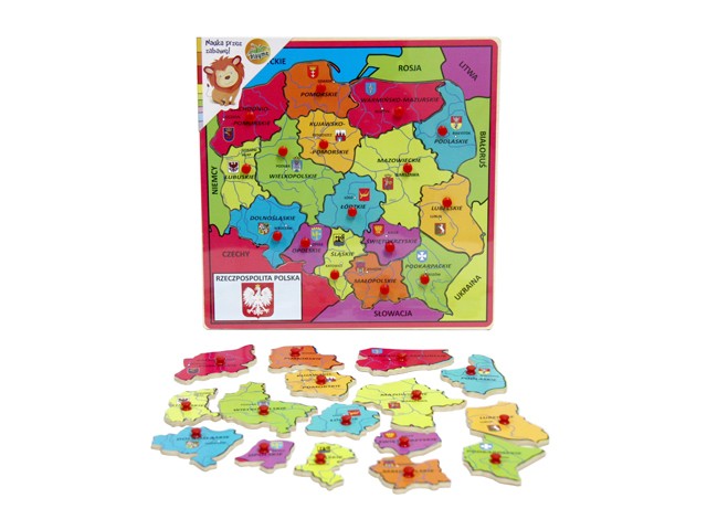 Drewniana mapa Polski, to edukacyjna pomoc dla najmłodszych uczniów. Dzięki pięknym i kolorowym puzzlom z uchwytem dzieci poznają mapę naszego kraju. Taka forma nauki kształtuje wyobraźnię i ułatwia zapamiętywanie.