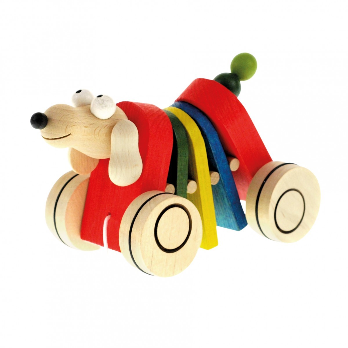 Piesek może teraz być radosnym przyjacielem twojego dziecka. Zabawny kolorowy piesek to drewniana zabawka do ciągnięcia, która zawsze będzie za tobą podążać. Dzięki ruchowi kół cały system się porusza.