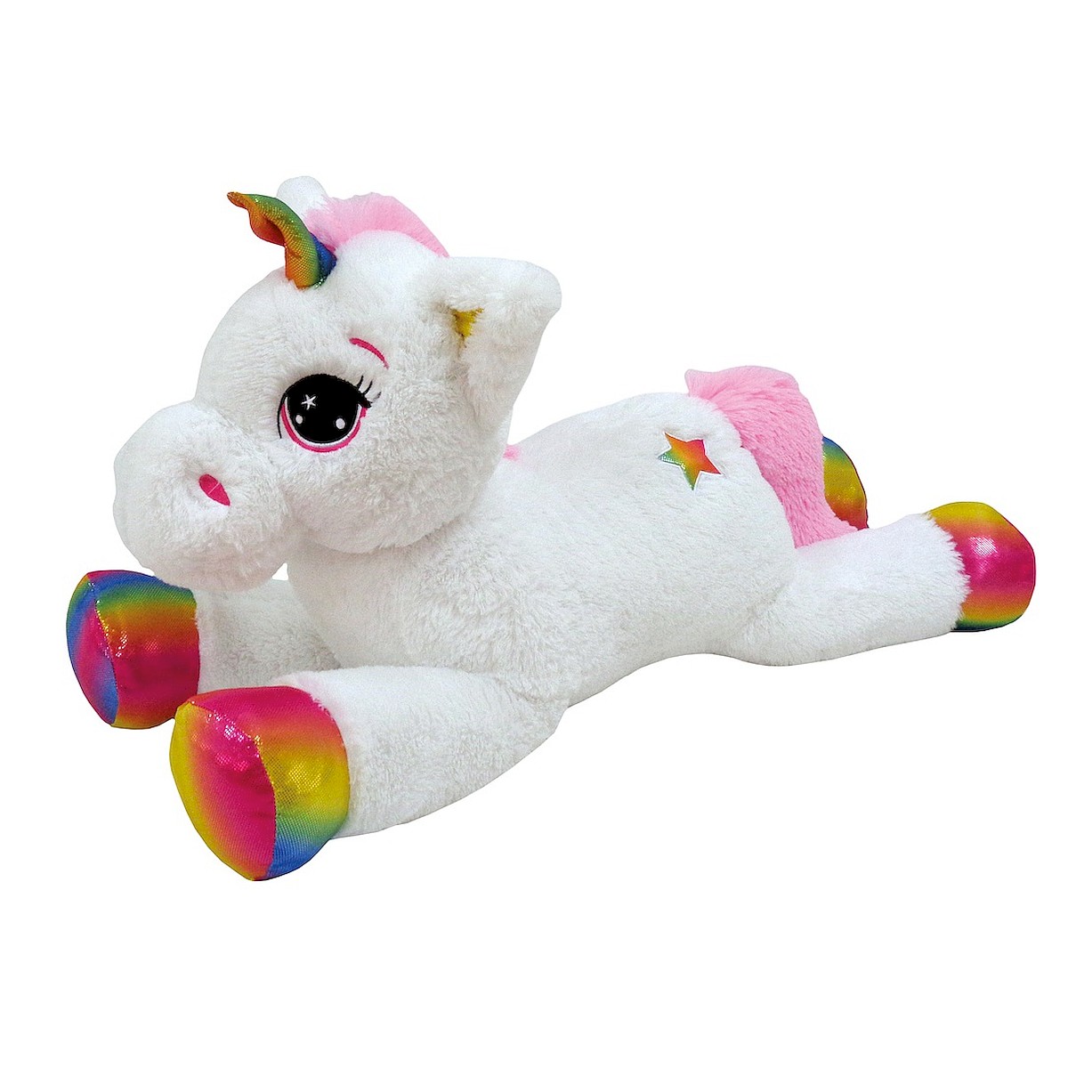 Pluszowy jednorożec, to duża miła w dotyku przytulanka. Bardzo duża zabawka pluszowa, jednorożec wykonany z białego pluszu. Na czubku głowy ma kolorowy róg, w tym samym kolorze są kopyta oraz wewnętrzna część uszu jednorożca. Grzywa i ogon, w pięknym różowym kolorze.
