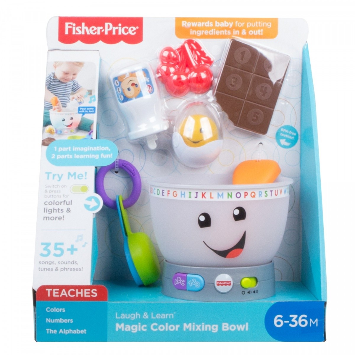 Twój mały szef kuchni może przygotować i zmieszać wszystkie składniki potrzebne do pysznej zabawy z Edukacyjnym Mikserem Malucha z linii Ucz się i śmiej!. Ten muzyczny mikser ze światełkami wie, kiedy kucharz wkłada do środka składniki, i nagradza go światełkami, muzyką, dźwiękami i wypowiedziami. Cztery wyjmowane produkty (jajko grzechotka, buteleczka mleka, gryzak czekolada, wiśnie), dwa akcesoria do gotowania (miarki i łyżka), dwa przyciski włączające muzykę i dźwięki oraz urocza świecąca buzia zapewnią Twojemu maluchowi świetną rozrywkę! Zabawa, która rozwija. Wczesna nauka: wesołe piosenki i wypowiedzi uczą dzieci liter, kolorów, liczenia i nie tylko! Zręczność: chwytanie elementów do zabawy i wkładanie ich do miski rozwija zręczność i koordynację rękaoko. Samodzielne myślenie: dzieci czeka doskonała zabawa w odkrywanie związków przyczynowo-skutkowych, gdy będą próbowały aktywować światełka i muzykę, wkładając produkty do miksera i naciskając przyciski. Zawartość edukacyjna w języku polskim.