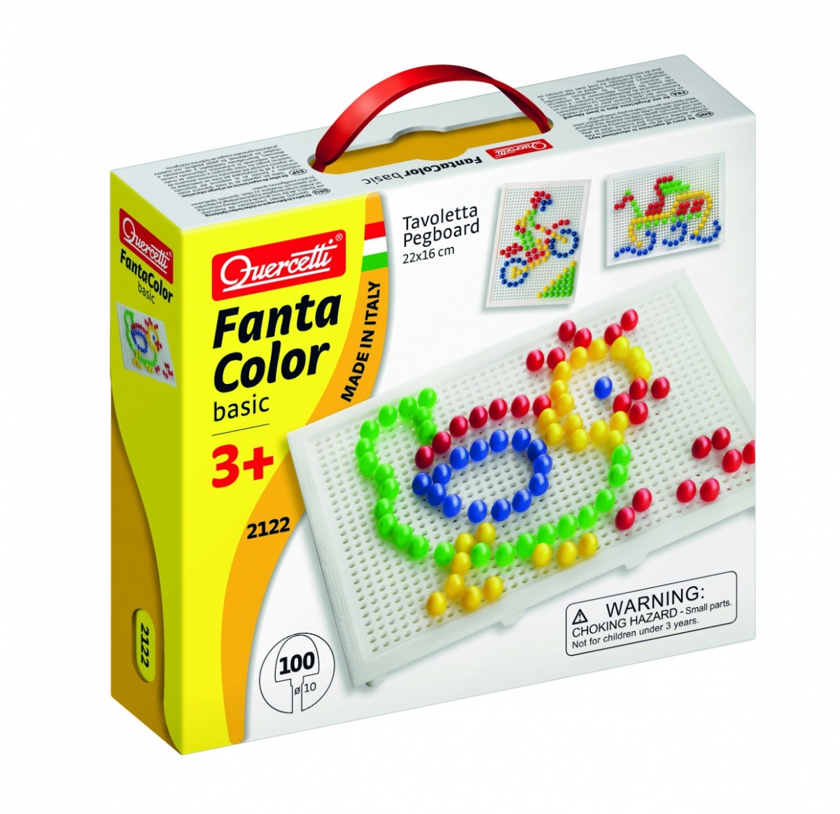 QUERCETTI MOZAIKA FANTACOLOR BASIC (KURKA) - Tworzenie mozaiki poprzez wstawianie kołeczków w perforowaną tablicę jest wspaniałą i twórczą zabawą, która stymuluje rozpoznawanie kolorów, rozwija umiejętności manualne oraz koordynację ruchową. Wszystkie elementy wykonane są z tworzywa wysokiej jakości, są elastyczne, zmywalne, mają zaokrąglone brzegi, bezpieczne.