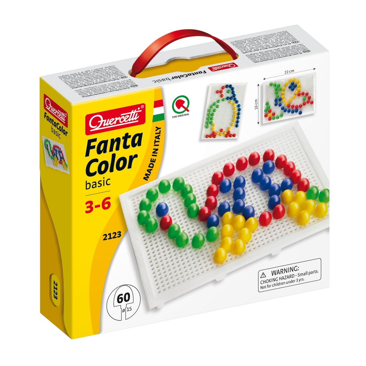 QUERCETTI MOZAIKA FANTACOLOR BASIC (ŻŁÓWIK) - Tworzenie mozaiki poprzez wstawianie kołeczków w perforowaną tablicę jest wspaniałą i twórczą zabawą, która stymuluje rozpoznawanie kolorów, rozwija umiejętności manualne oraz koordynację ruchową. Wszystkie elementy wykonane są z tworzywa wysokiej jakości, są elastyczne, zmywalne, mają zaokrąglone brzegi, bezpieczne. Zabawka została wyprodukowana we Włoszech.