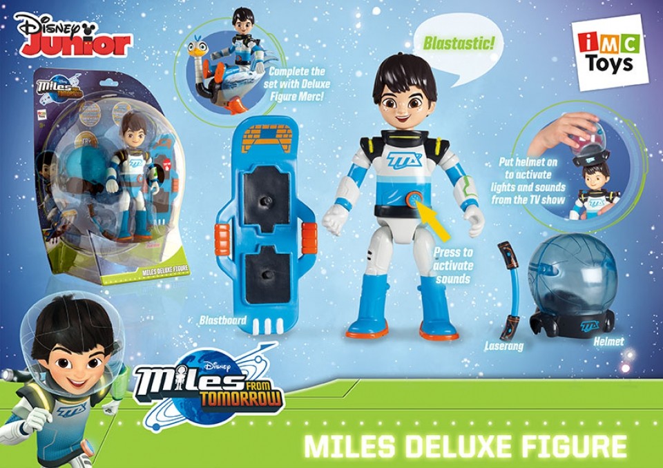 Ekskluzywna figurka Milesa z serii Miles z Przyszłości! Po założeniu hełm świeci i wydaje dźwięki. Naciśnij przycisk na pasku, a Miles wypowie kilka wersów znanych z serialu telewizyjnego. Ustaw Milesa na Blastboardzie i znów usłyszysz efekty dźwiękowe. W zestawie: Laserang, hełm i Blastboard!