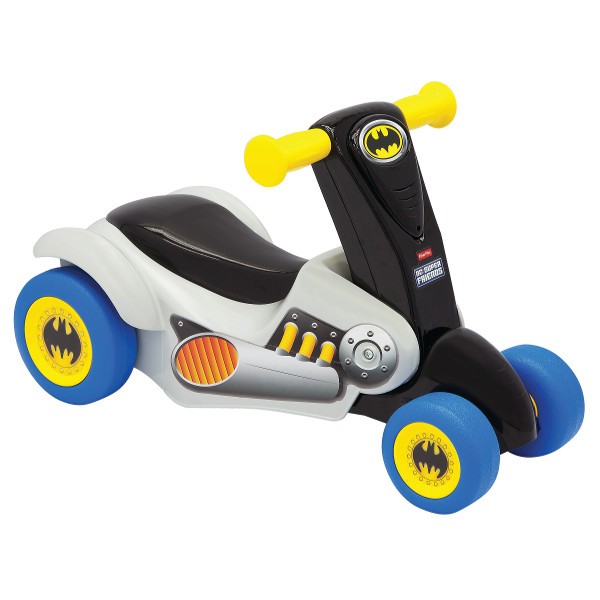 Teraz twój maluch może poczuć się jak prawdziwy superbohater na tym niezwykłym jeździku Batmana 2 w 1. Niezwykły projekt umożliwiający szybkie i proste przekształcenie jeździka w hulajnogę: wystarczy wcisnąć przycisk! Zabawka gra wesołe melodie i dźwięki i zwroty z Batmana.