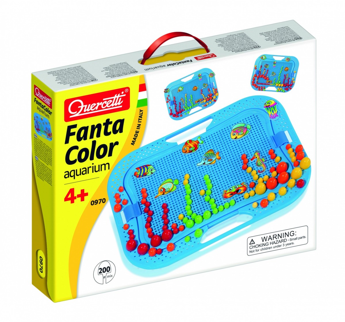 QUERCETTI MOZAIKA FANTACOLOR AKWARIUM, tworzenie mozaiki poprzez wstawianie kołeczków w perforowaną tablicę zgodnie z proponowanym wzorem bądź własną wyobraźnią jest wspaniałą i twórczą zabawą. Zabawka stymuluje rozpoznawanie kolorów, rozwija umiejętności manualne oraz koordynację ruchową. Zestaw składa się z 200 kołeczków o różnej średnicy, 8 kołeczków 3D z motywami morskimi, kartonowych kart – wzorów oraz walizeczki z rączką, która po rozłożeniu staje się podstawką i tabliczką o wymiarach 28x20cm.