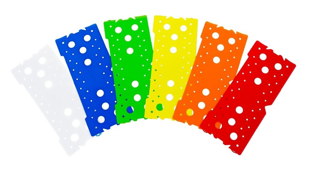- Dostępne w zestawie barwy topów: biała, niebieska, zielona, żółta, pomarańczowa, czerwona. Wraz z oryginalnie zamontowaną czarną daje to aż 7 możliwości dopasowania kolorystyki.