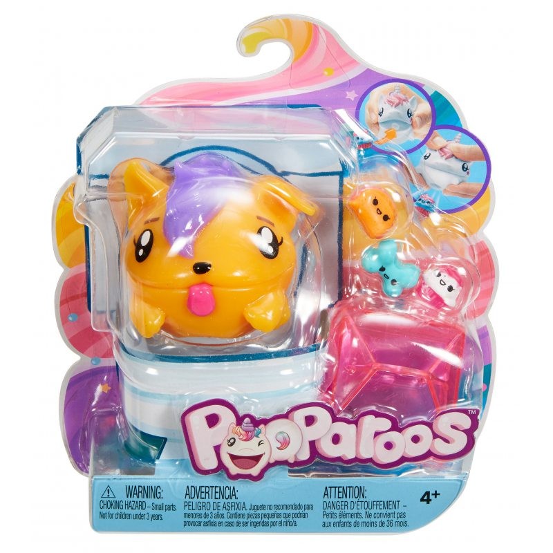 Figurki Pooparoos to sympatyczni przyjaciele do ściskania, którzy uwielbiają jeść i korzystać z toalety! Wybierz uwielbiane przez dzieci zwierzątko takie jak króliczek, świnka czy piesek albo zdecyduj się na jedną z magicznych postaci: smoka, jednorożca lub potworka. Do każdego cudownego przyjaciela dołączono trzy urocze jedzonka oraz tacę do ich serwowania. Nakarm swoje stworzonko, ściśnij je dwoma rękami i sprawdź, jak jedzenie przezabawnie z niego wyskakuje! Zwierzątka lubią także przyczepiać się do różnych rzeczy, takich jak ołówek lub Twój palec. Cała kolekcja obejmuje osiem stworzonek, możesz więc stworzyć kolorową drużynę uroczych Pooparoos! Sprzedawane oddzielnie w zależności od dostępności.