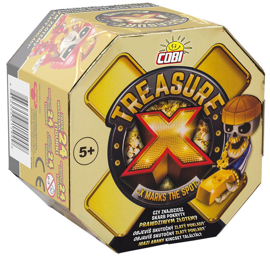 Treasure X to niesamowita niespodzianka - kolekcjonerska kolekcja z wielowarstwowym odkrywaniem, fajnymi postaciami i szansą na odnalezienie skarbu pokrytego PRAWDZIWYM ZŁOTEM! Rozerwij złotą warstwę, kop, wlej wodę do skrzyni. Przechodź przez kolejne poziomy i odkrywaj ukryte w nich sekrety! Czy będziesz Łowcą, który odnajdzie skarb pokryty PRAWDZIWYM złotem, czy zadowolisz się nagrodą pocieszenia?!