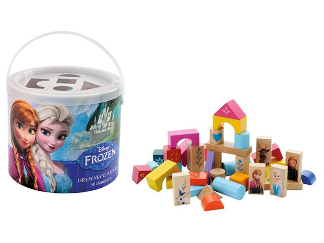 Klocki drewniane o różnych kształtach. Na wybranych klockach umieszczone są postaci z bajki Karina Lodu.