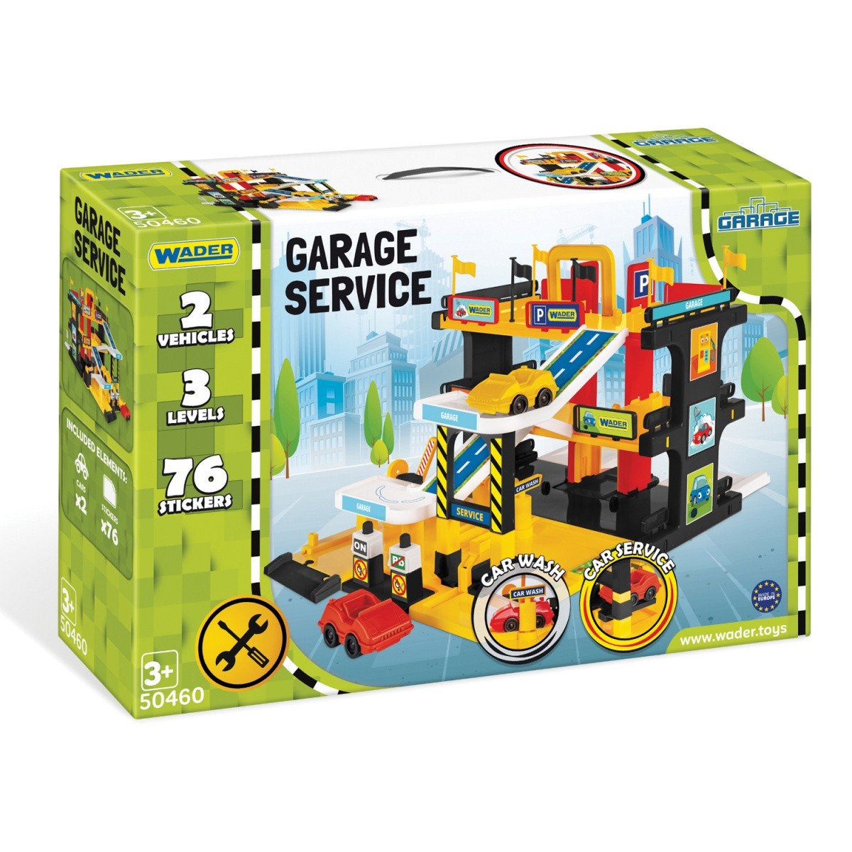- Nowoczesny, realistycznie zaprojektowany garaż wyposażony jest w windę transportującą samochody jeden z trzech poziomów, rampę, myjnię samochodową, dystrybutor paliwa, serwis samochodowy, liczne dekoracje i 2 autka.