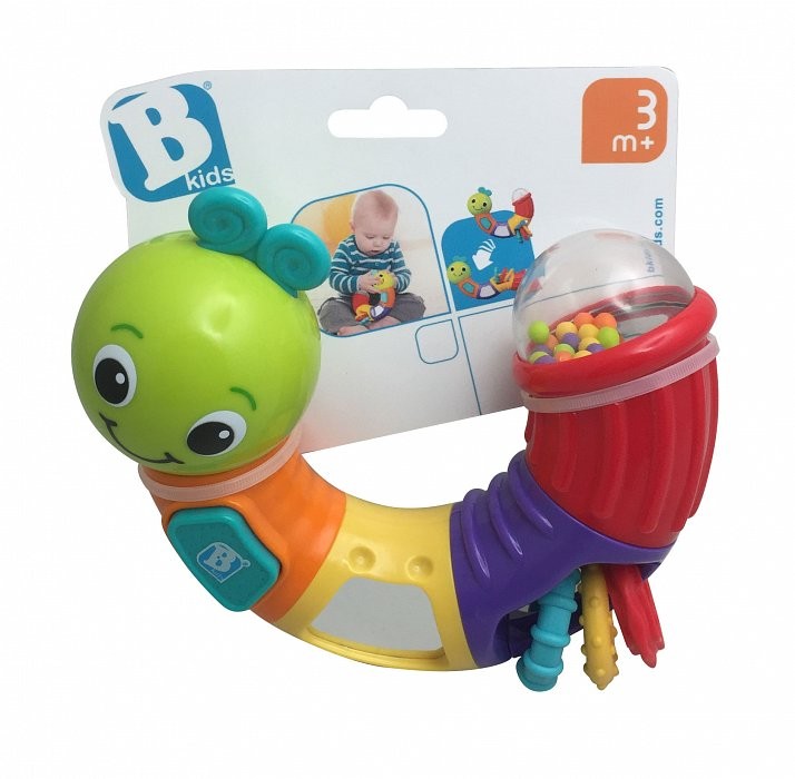 Potrząśnij nią a usłyszysz jak koraliki grzechoczą. Zawiera lusterko oraz 3 kolorowe gryzaczki. Każdą część gąsieniczki można obrócić i usłuszeć zabawne dźwięki.