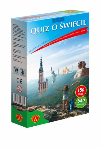 Na 45 kartach jest 180 pytań i 540 wariantów odpowiedzi. Podczas gry trzeba wykazać się również swoją zręcznością, strzelając z katapulty do celu." Quiz o Świecie" to atrakcyjna i emocjonująca rozrywka dla całej rodziny, a jej uczestnicy mogą w czasie zabawy poszerzyć swoje informacje o świecie.