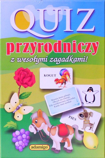 Gdy dojrzeje to się zmienia, w milion latawców do puszczenia. Te i inne równie ciekawe zagadki znajdują się w grze Quiz Przyrodniczy. Spróbuj ze swoim maluchem znaleźć ich rozwiązanie. Świetna zabawa gwarantowana. Zestaw zawiera aż 100 kart z zabawnymi rymowanymi zagadkami o zwierzętach i roślinach, plansze do gry, cztery pionki, a także dwa okrągłe żetony. Gra uczy logicznego myślenia, kojarzenia faktów, rozumienia ze słuchu i jest także ciekawą alternatywą nauki o przyrodzie. Oprócz cech edukacyjnych zestaw skłania dzieci do pozytywnej rywalizacji w grupie. Zestaw gry zawiera: 100 kart z zagadkami, plansze do gry, 4 pionki, 2 okrągłe żetony. Gra przeznaczona:dla 2 do 4 graczy, w wieku od 6 lat.