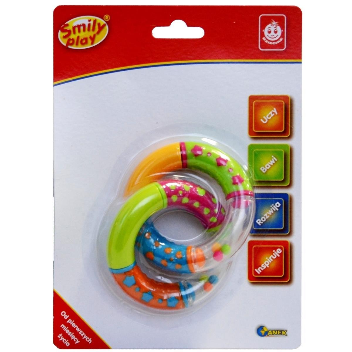 Grzechotka w kształcie koła dzięki swoim żywym kolorom szybko skupia uwagę dziecka. Dodatkowo kolorowe kuleczki wydające dźwięki zachęcają do potrząsania zabaweczką, co z kolei kształtuje rozwój słuchu i zdolności wzrokowomanualne dzieciaczka.