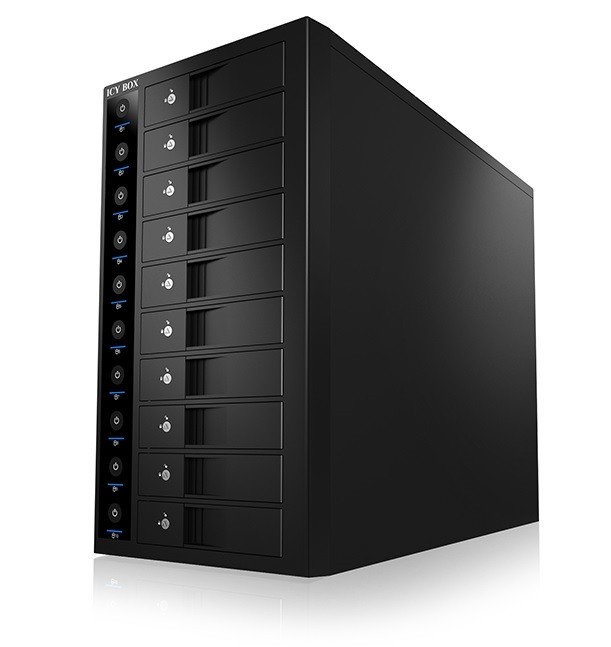 Ta zewnętrzna obudowa oferuje miejsce na dziesięć dysków twardych SATA I / II / III. Składa się głównie ze stali, a zatem jest wytrzymała, bezpieczna i bardzo dobrze odprowadza ciepło. System chłodzenia dysków obsługiwany jest przez jeden duży wentylator o średnicy 140 mm, zamontowany został z tyłu urządzenia, wloty powietrza wewnątrz wnęki napędu znajdują się z przodu. Drzwi szafy posiadają indywidualny zamek na klucz.