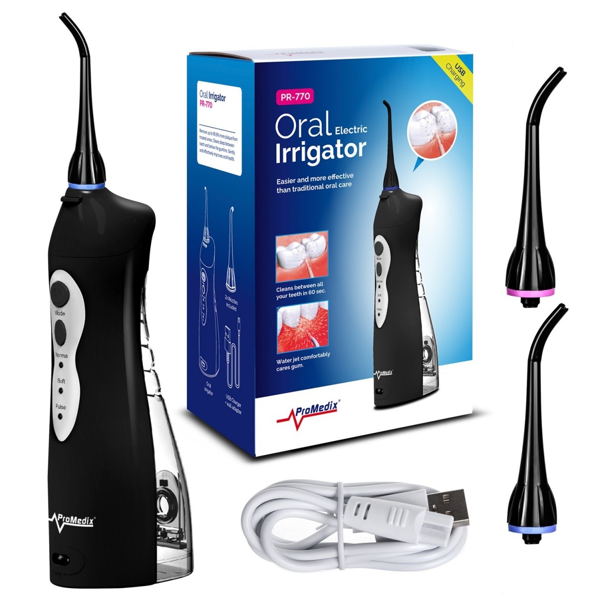 PR-770 to nowoczesny irygator bezprzewodowy, którego silny strumień wody precyzyjnie usuwa resztki pokarmu z przestrzeni międzyzębowych, utrzymując higienę jamy ustnej. Silny strumień o sile do 8,5 Bar eliminuje problem z niedoczyszczeniem aparatów ortodontycznych, mostów lub implantów. Irygacja pozwala znacznie zmniejszyć krwawienie z dziąseł i ilość bakterii, które mogą wywoływać zapalenia. Irygator Promedix czyści oraz masuje dziąsła, powodując lepsze ich ukrwienie a co za tym idzie poprawia ich ogólną kondycję. Łatwość obsługi oraz silny strumień wody pozwalają utrzymać higienę jamy ustnej na najwyższym poziomie!