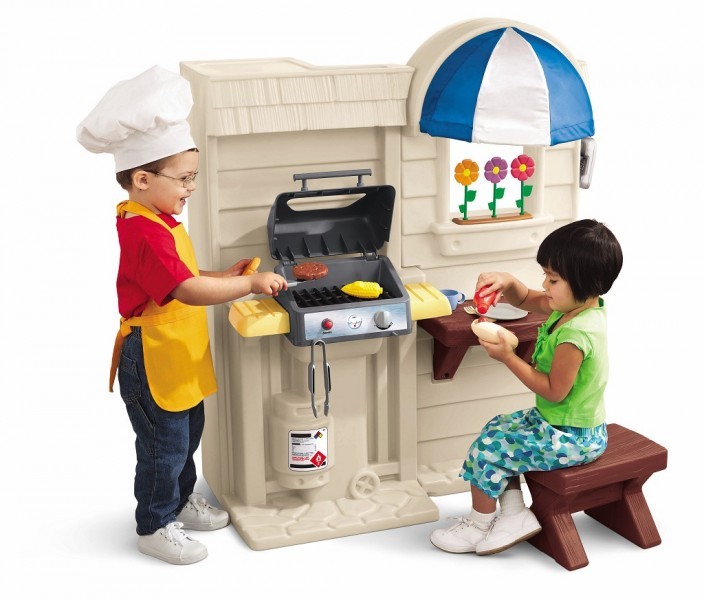 Luksusowa kuchnia wyposażona jest w ekspres do kawy, zamykane na magnes drzwi lodówki i palnik wydający elektroniczne dźwięki. Okno, przestronny zlew z nowoczesnym kranikiem, piecyk, zmywarka do naczyń i różne schowki z pewnością uatrakcyjnią zabawę. Druga strona kuchni to kamienne patio zwieńczone markizą z tkaniny. Blat piknikowy z ławą, w oknie kolorowe kwiatki. Grill wydaje dźwięki, a spod spodu migoczą płomyki. W zestawie czapka szefa kuchni i 27 dodatkowych akcesoriów.