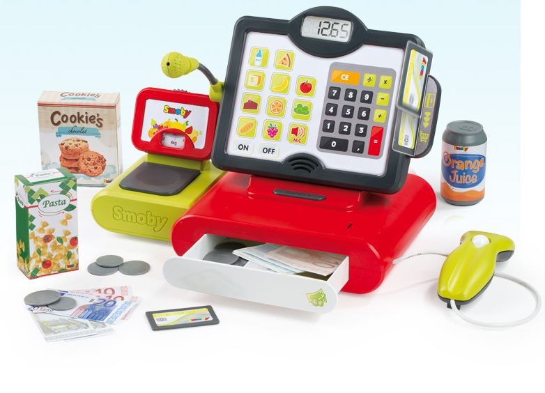 Realistyczna elektroniczna kasa z mechaniczną wagą.