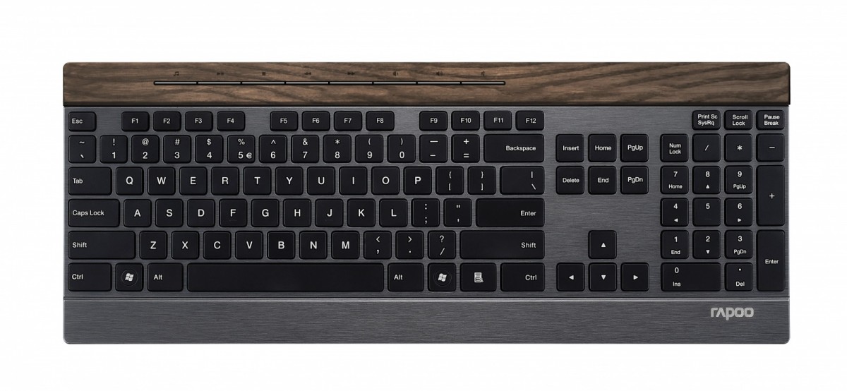 Unikalna klawiatura reprezentuje kultowy styl Rapoo. Została zainspirowana popularnym zdobywcą nagród modelem E9270P. Wyjątkowo smukła i wytrzymała obudowa, wykonana ze szczotkowanej stali nierdzewnej oraz stopu aluminium, została wzbogacona pięknym drewnianym elementem, umieszczonym na brzegu klawiatury. Drewniane wykończenie jest przyjemne w dotyku i nadaje uroku urządzeniu. To właśnie w tym miejscu umieszczono przyciski funkcyjne, które umożliwiają szybki dostęp do najważniejszych funkcji multimedialnych.