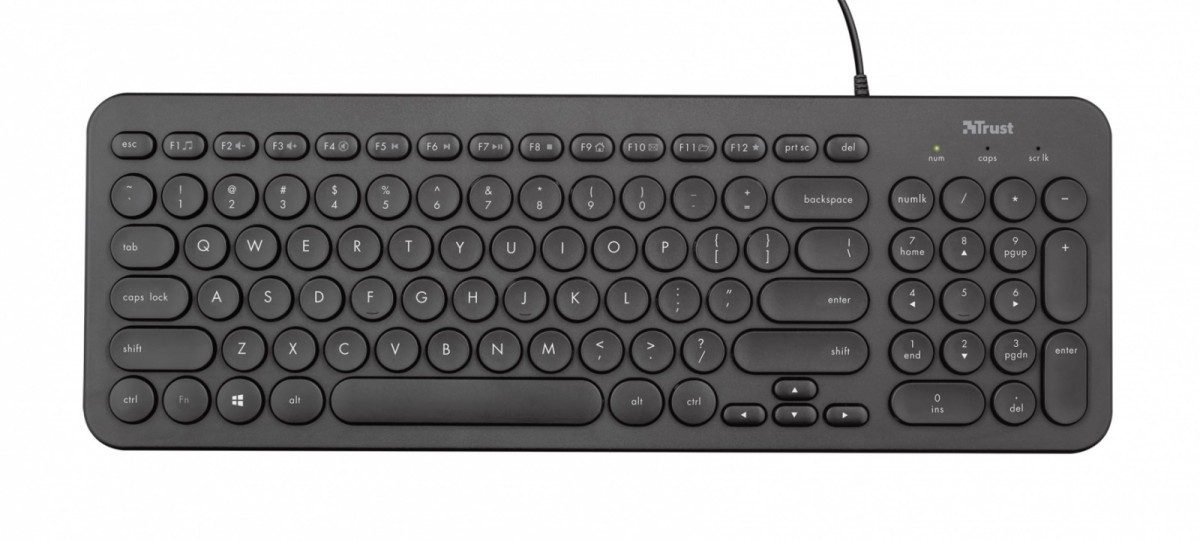 - Płaskie i zaokrąglone klawisze poprawiają wygodę pisania