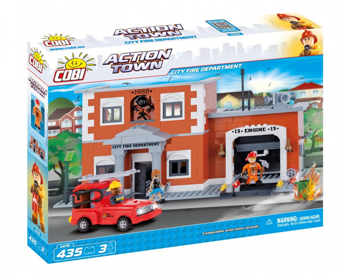 Na parterze znajduje się pokój dyspozytorki z laptopem i telefonem komórkowym. Na piętrze jest pokój z miejscami do odpoczynku dla dyżurujących strażaków. Oba pietra połączone są tradycyjnie rurą do szybkiego zjazdu z piętra. W budynku jest też garaż z samochodem strażackim. Zestaw zawiera liczne akcesoria, dużo ruchomych elementów i klocki świecące w ciemności.