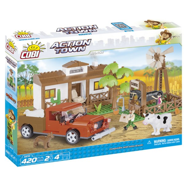 Jest tu koń, którego trzeba zabrać na przejażdźkę oraz pozostałe zwierzęta takie jak: krówka i owieczka, którymi trzeba zaopiekować się i nakarmić je. Wszystkie prace na ranczo nadzoruje pies Azor, dzielny stróż. Gospodarz właśnie przygotował auto, aby przewieźć owieczkę do strzyżenia. Samochód ma otwieraną klapę tylną oraz pokrywę silnika. Czeka Cię wiele pracy, a więc do dzieła. Zestaw sklada się z 420 elementów w tym 6 figurek: gospodarz, dżokejka, pies, owca, krowa i koń.