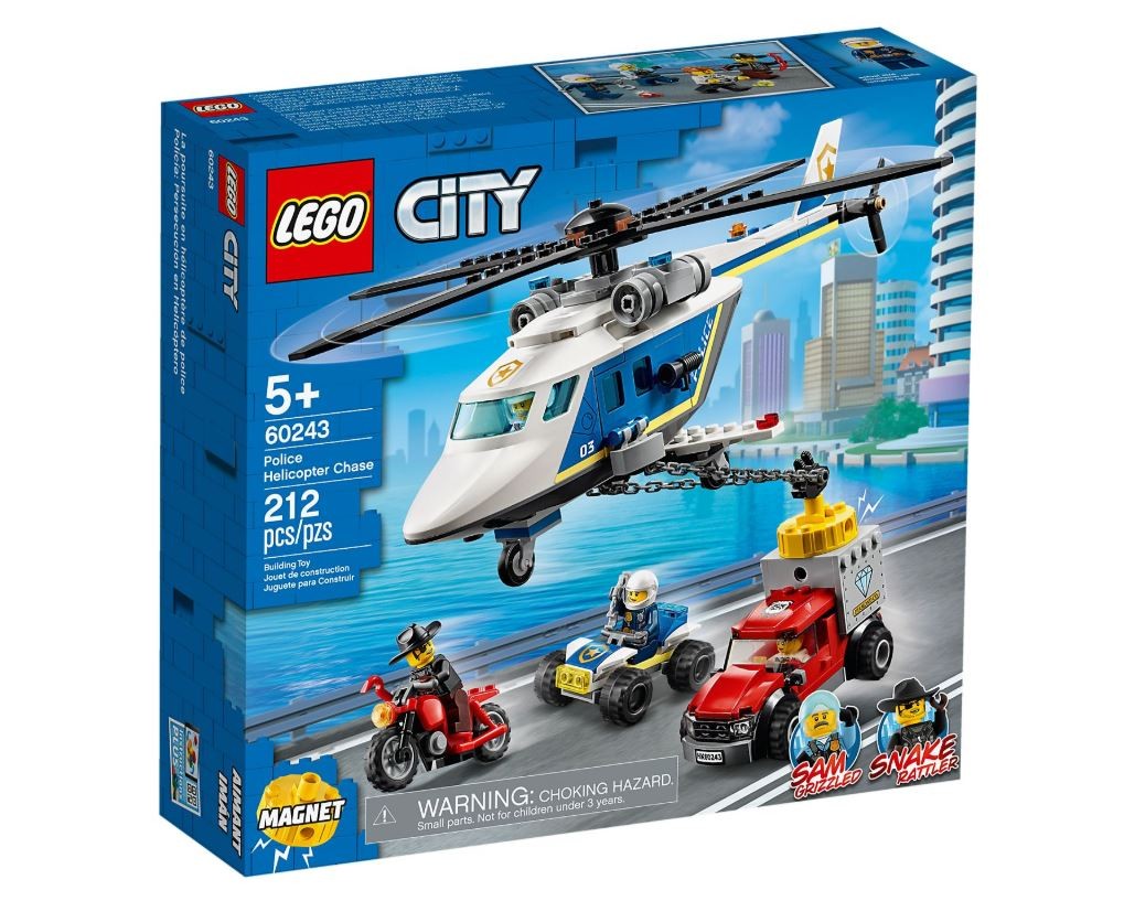 - Zestaw policyjny LEGO City (60243) zawiera kilka pojazdów, w tym zabawkowy helikopter z silnym magnesem do podnoszenia magnetycznych przedmiotów, takich jak ciężarówka złodziejaszków! Świetna zabawka dla dzieci zainteresowanych emocjonującymi pościgami samochodowymi.