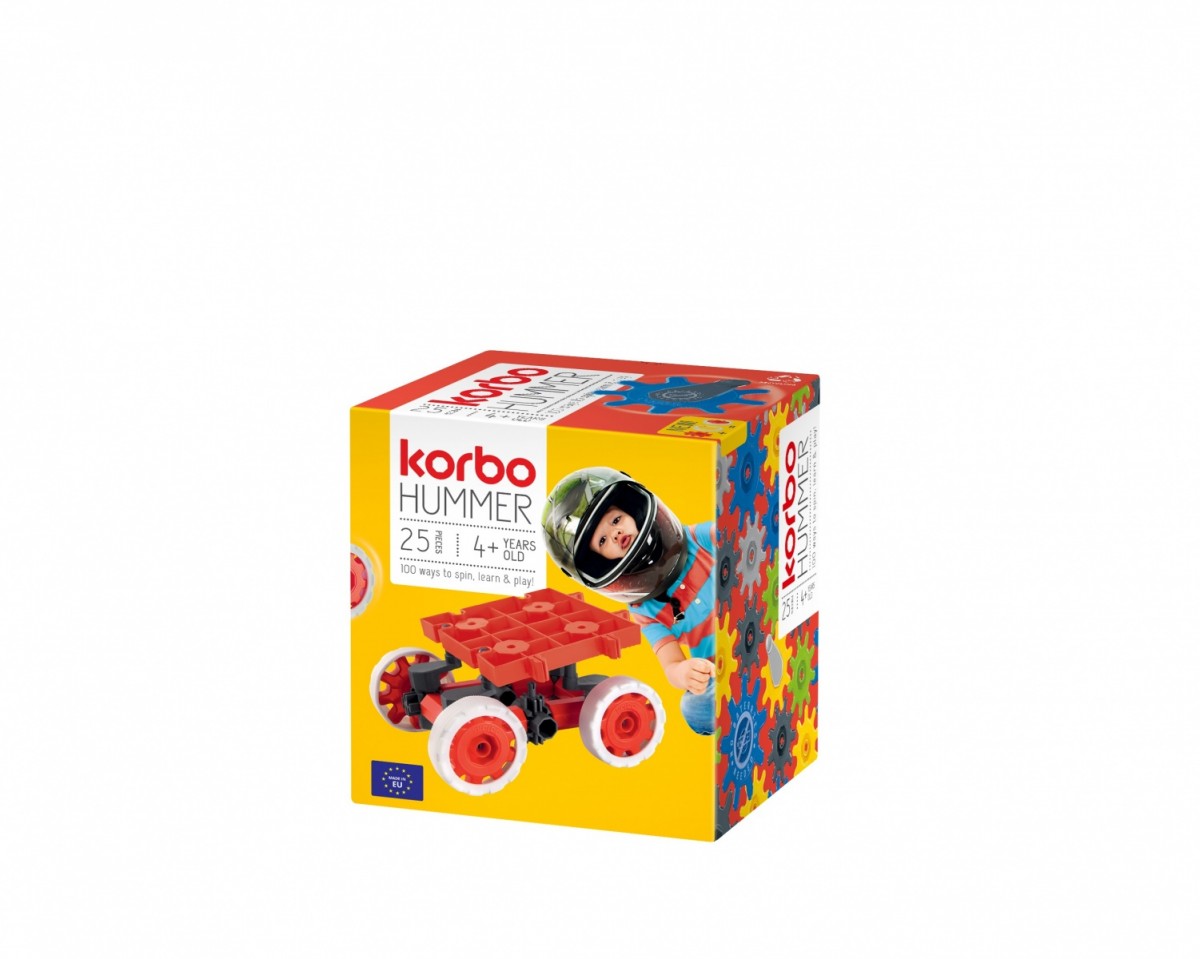 KORBO HUMMER 25 to zestaw klocków i kół zębatych z oponami. Kolorowe i łatwe w łączeniu elementy dają możliwość tworzenia niesamowitych konstrukcji, jakimi są pojazdy z oponami na kołach zębatych, którymi może się bawić zarówno małe jak i większe dziecko. Łatwe do skonstruowania pojazdy lekko i daleko suną po gładkiej powierzchni, dzięki czemu świetnie sprawdzą się w wyścigach. Specjalna górna platforma pojazdu pozwala na transportowanie swoich ulubionych zabawek takich jak ludziki czy małe samochody. W instrukcji zaproponowano dodatkowo zbudowanie kilku innych pojazdów.