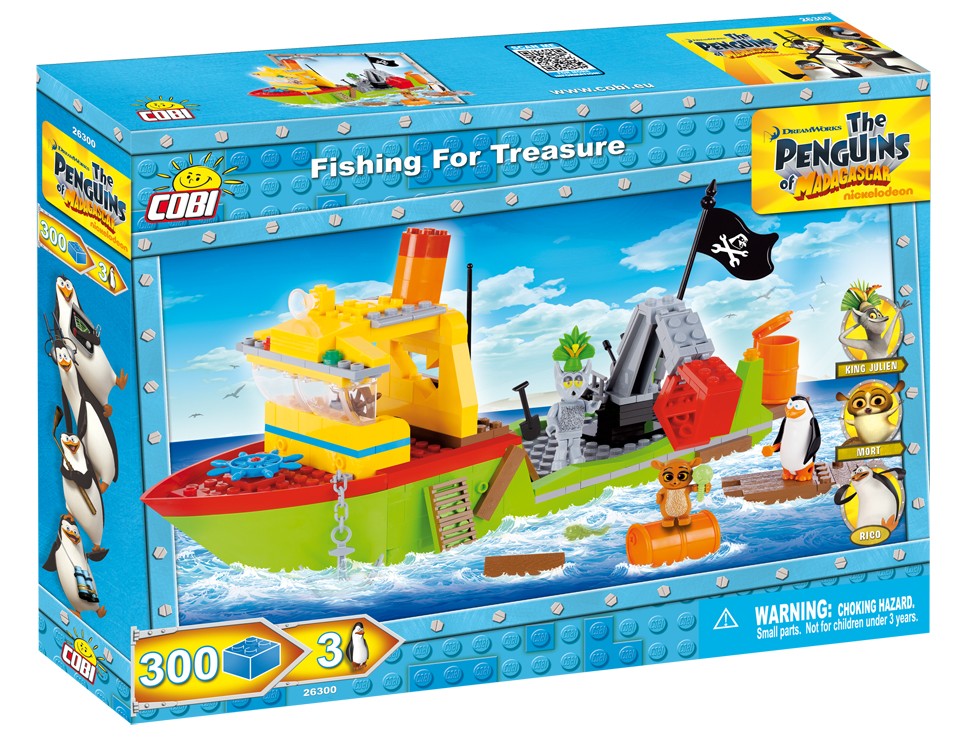 Okazuje się, że Rico postanowił wybrać się razem z nimi. Gdy tylko statek zostaje odcumowany od burty Rico szybko wskakuje, jako nieproszony pasażer. Na statku znajduje się ogromna kotwica oraz ramię chwytaka do podnoszenia beczek z rybami. W zestawie znajdziesz 300 elementów w tym 3 figurki: Król Julian, Mort i Rico.
