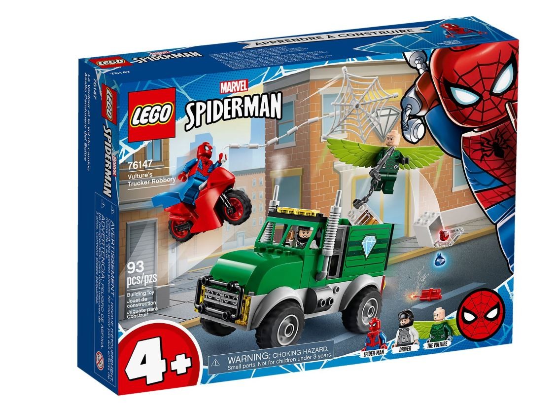 - Pełen atrakcji zestaw zawiera minifigurki LEGO Spider-Mana, Sępa i kierowcy, a także motocykl Spider-Mana i furgonetkę bankową. Furgonetka ma wybuchający tył oraz silnik, który można zamontować na masce.