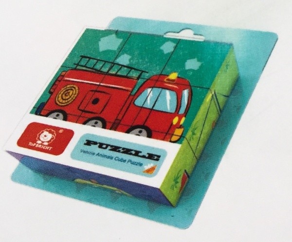 Klocki drewniane z motywem wozu strażackiego i innych pojazdów firmy Top Bright. Zabawka składa się z 9 klocków. Zabawka daje możliwość ułożenia 6 różnych obrazków.