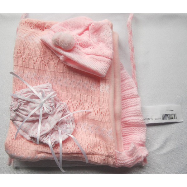 Różowy zestaw dla bobaska o rozm. 35 cm. Kocyk zakończony falbanką, majteczki i czapka. Całość zapakowana w tiulową torebeczkę. Wszystkie ubranka z kolekcji Llorens zostały zaprojektowane i uszyte w Hiszpani.