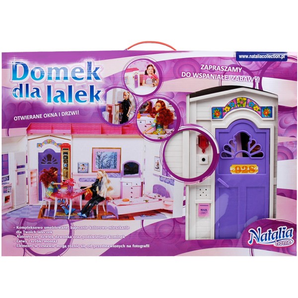 Posiada wiele funkcji - m.in.: świecący kominek i dźwięk dzwonka uruchamiany przyciskie na drzwiach. Domek rozkłada się ukazując różne pokoje codziennego użytku.