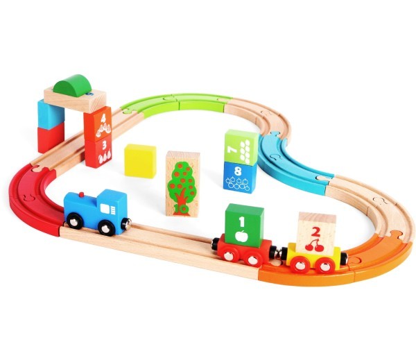 Zestaw składa się z 29 elementów, wśród których są tory, lokomotywa, wagoniki oraz klocki z namalowanymi cyferkami i różnorodnymi obrazkami owoców. Wagoniki łączą się ze sobą za pomocą magnesów. Tory są kompatybilne z innymi drewnianymi zestawami.