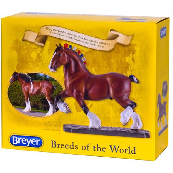 Rasa Clydesdale pochodzi z rejonu Lanarkshire nad rzeką Clyde w Szkocji. Te potężne konie, których wysokość może dochodzić do ponad 180 cm, wykorzystywane były pierwotnie w Wielkiej Brytanii jako konie pociągowe i do pracy na roli, a z czasem jak wzrastała ich popularność eksportowane były na cały świat. Dzisiaj jest to bardzo popularny koń do jazdy, ale niektóre są nadal wykorzystywane do celów rolniczych. Model konia dzięki temu, iż jest na stałe zamocowana do podstawy jest idealna do eksponowania.