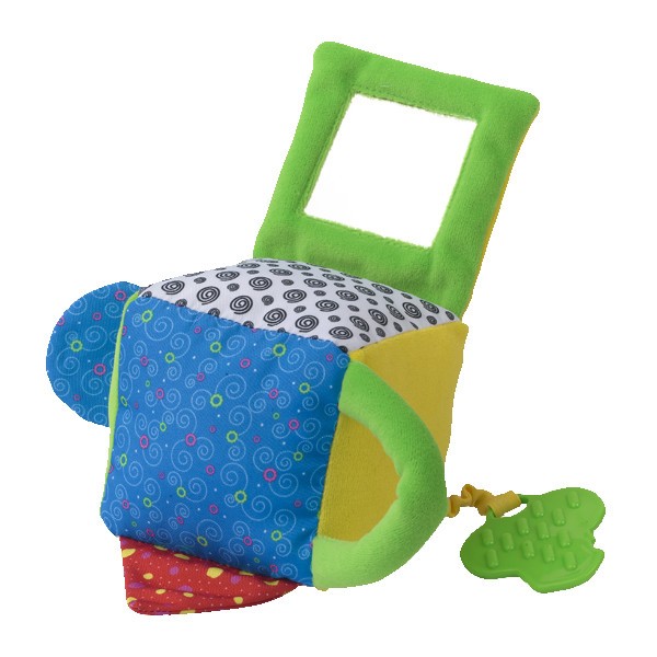 Ma szeleszczące elementy oraz bezpieczne lusterko. Ponadto kosteczka ma plastikowy gryzaczek, który odpowiednio wykorzystany przyniesie ukojenie ząbkującemu maluchowi.