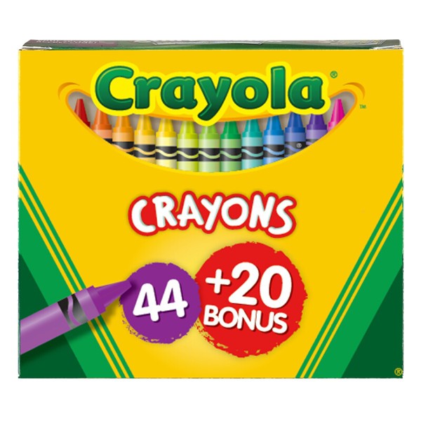 64 tradycyjne kredki świecowe Crayola we wszystkich potrzebnych kolorach. Taka ilość kredek stanowi solidne wyposażenie przedszkolaka i na lekcje plastyki.