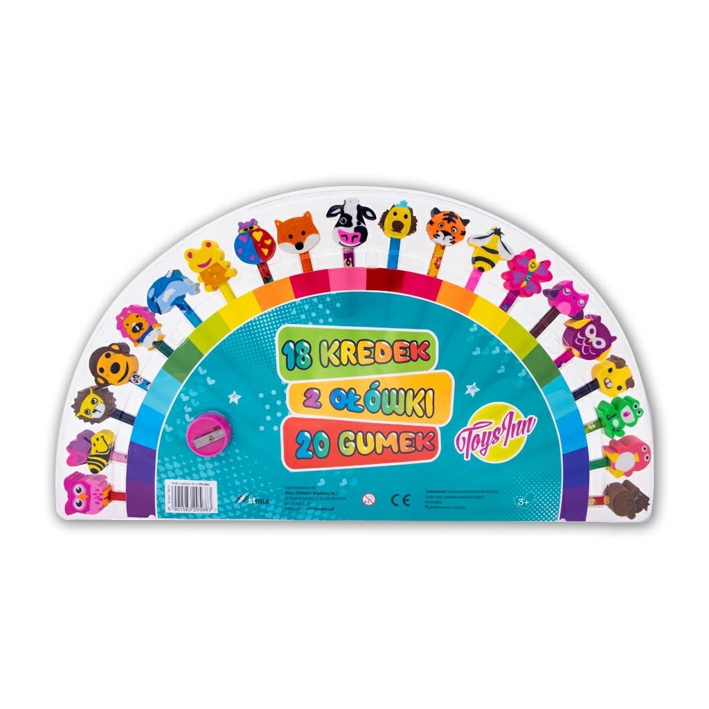 Zestaw kredek z uroczymi gumkami w kształcie zwierzątek. Duży zestaw kolorów uraduje każdego młodego rysownika. Kredki ozdobione są kolorowymi wzorami i zakończone gumkami w różnych kształtach.