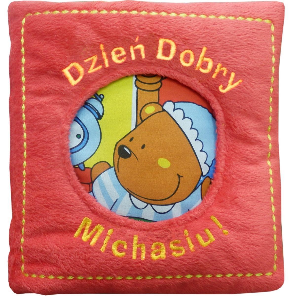 Książeczka Dzień Dobry Michasiu ma 6, pięknych, kolorowych stron (plus okładka). Trójwymiarowe elementy np.: szaliczek zrobiony na drutach, piszczącą kaczuszkę, czapeczkę z bąbelkiem, zabawki do schowania w kuferku, papier w toalecie.