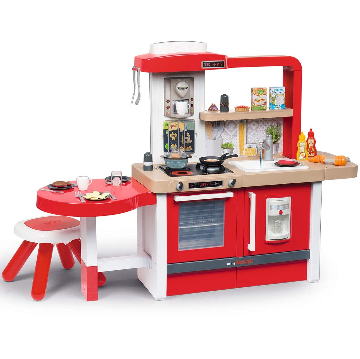 - Zestaw ma wiele miejsca do zabawy - dodatkowy blat oraz jadalnię, zlewozmywak, ekspres do kawy z kapsułkami, piekarnik, lodówkę, kostkarkę do lodu, półeczki oraz krzesełko