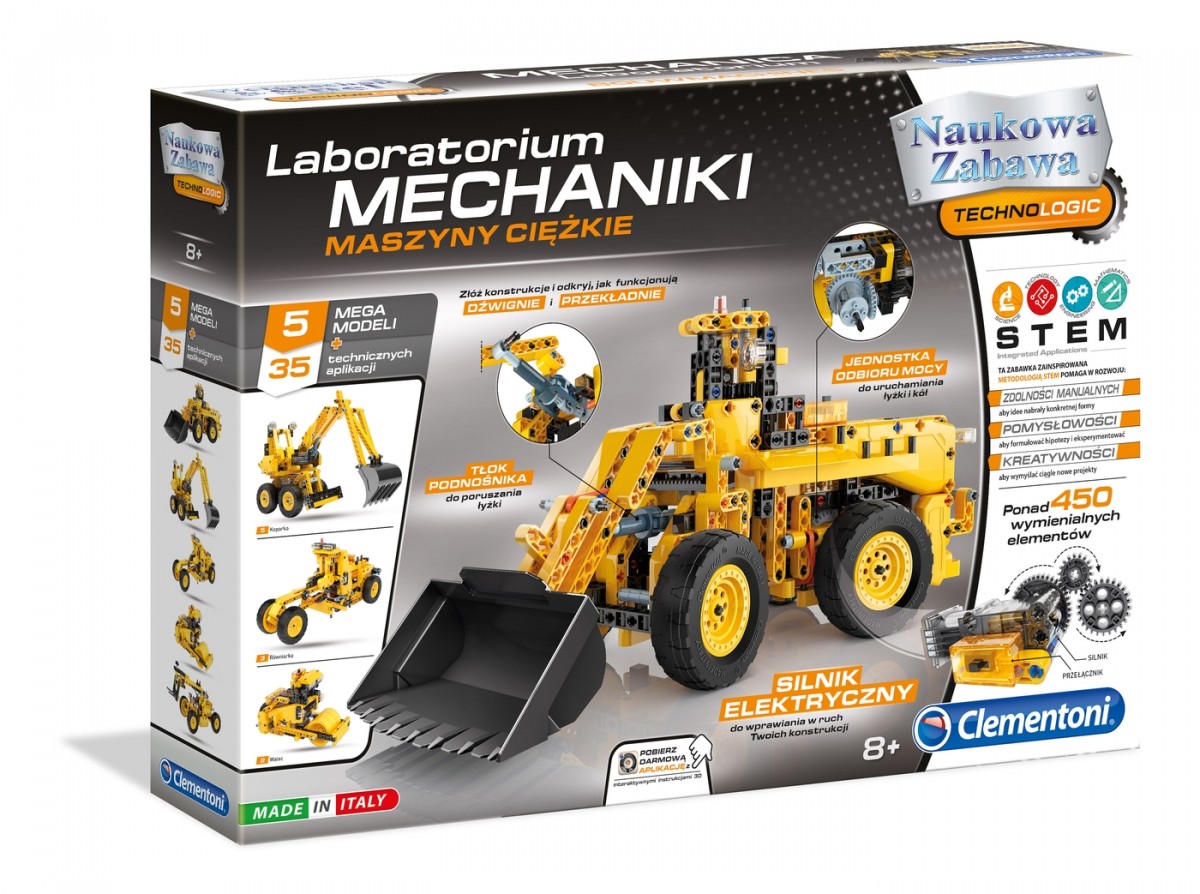 Bogaty zestaw naukowych poprowadzi dzieci podczas odkrywania zasad działania maszyn ciężkich. Dzięki 450 elementom dzieci mogą tworzyć 5 dużych modeli dynamicznych z silnikiem elektrycznym, a także z 35 praktycznymi formami aktywności mogą dowiedzieć się wszystkiego na temat dźwigni i przekładni. Instrukcja zawiera wszystkie wskazówki potrzebne do montażu modeli i uczy pierwszych koncepcji inżynierii, fizyki i mechaniki. Dzięki stronie internetowej jest możliwe, aby dowiedzieć się więcej o wszystkich częściach zestawu, z dodatkowymi opisami i animacji 3D. Konstrukcja, koncepcja i produkcja są całkowicie Made in Italy.