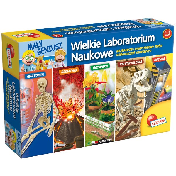 Mały Geniusz Wielkie Laboratorium Naukowe to kompleksowy zbiór doświadczeń naukowych, który zawiera pięć ciekawych i bardzo bezpiecznych eksperymentów: optyka, paleontologia, botanika, geofizyka i anatomia. Dzieci mogą odkopać dinozaura, zbudować szkielet człowieka, posadzić roślinkę, stworzyć symulację erupcji a także poznać podstawowe zasady optyki.