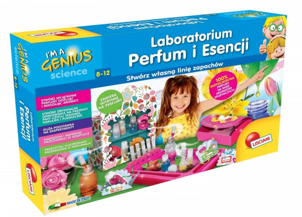 Laboratorium Perfum i Esencji zawiera liczne akcesoria oraz duży, ilustrowany podręcznik przedstawiający instrukcję oraz fascynującą historię perfum, od starożytności po czasy współczesne.