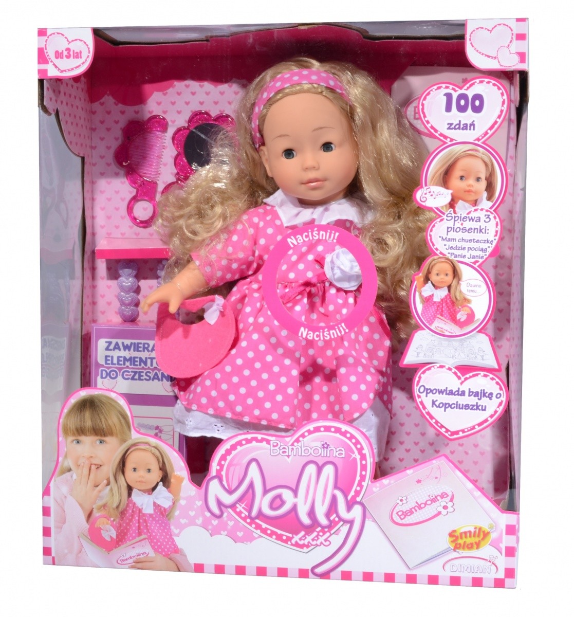 Lalka ma długie, lśniące i delikatnie kręcone włosy, które można bez końca czesać i układać. Molly nie tylko zachwyca swoim wyglądem, ale również pomaga małej dziewczynce uczyć się poprzez zabawę – podczas słuchania bajek, śpiewania i kolorowania. Twoja córeczka będzie zachwycona swoją nową przyjaciółką! Molly szybko stanie się ulubioną zabawką Twojej małej księżniczki i powiernicą jej pierwszych dziecięcych sekretów.