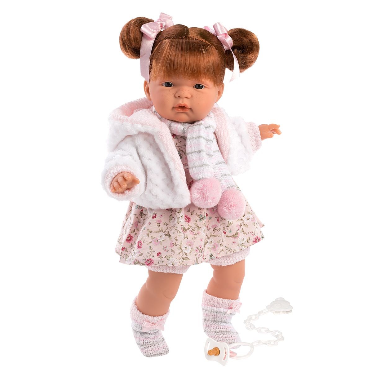Wyprodukowana w Hiszpanii piękna lalka płacząca 38 cm marki Llorens jest wyjątkową zabawką dla każdego dziecka. Kate jest ubrana w kwiecistą sukienkę, różowe bloomersy, szalik w paski z pomponami, futrzaną kurtkę z kapturem i skarpetki z kokardkami. Lalka ma śliczną, delikatną buzię, granatowe oczęta, piegi na policzkach i rude włoski z grzywką spiętą w dwie kiteczki z kokardkami. Jest przeuroczą dziewczynką, która swoją urodą zachęci każdego do zabawy. Brzuszek lalki jest wypełniony miękką wyściołką, dzięki czemu idealnie nadaje się do przytulania. Do lalki dołączony jest smoczek, który pełni ważną funkcję. Po zabraniu lalce smoczka, będzie ona płakać i wołać mama, papa jak prawdziwe dziecko. Lalka została zapakowana w ozdobny karton. Kochamy hiszpańskie lalki Llorens!