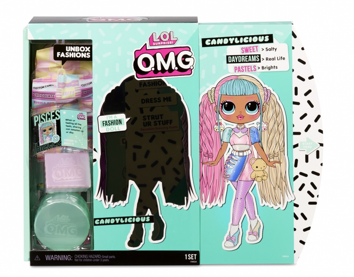 Rozpakuj lalkę L. O. L. Surprise! O. M. G. Candylicious, która ma zestaw 20 niespodzianek. Ma wspaniałe rysy twarzy, piękne włosy i własny bajeczny styl. Lalka Candylicious to wyjątkowe doświadczenie rozpakowywania.