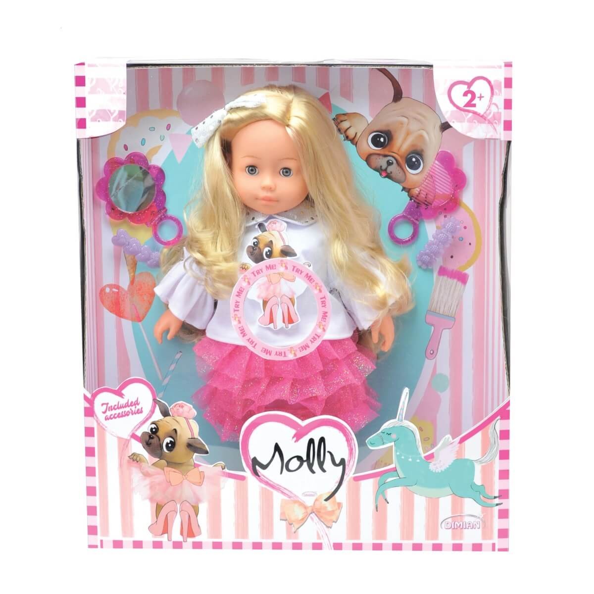 Molly mówi po polsku 50 słów. Ma miękki brzuszek, ruchome, szklane oczy, jej włosy można myć. Do zestawu dołączono przybory do czesania lalki.