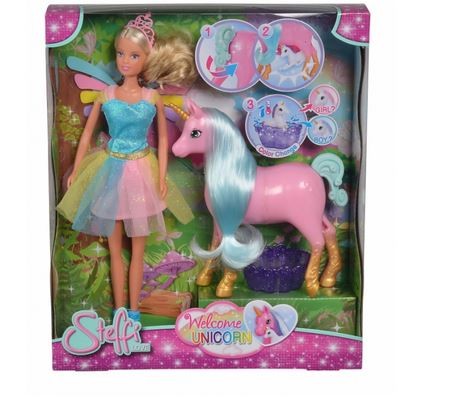 Steffi jako wróżka z jednorożcem w ciąży, wystarczy przyciągnąć do siebie ogon jednorożca, a z jego brzucha wypadnie jednorożec-noworodek. Dodatkowa funkcja zabawy - płeć jednorożca-noworodka jest niespodzianką a jego grzywa zmienia kolor. Aby poznać jego płeć, należy umieścić go w dołączonej wanience, polać ciepłą wodą i przekonać się, jakiego koloru będzie jego grzywa, różowego czy niebieskiego.
