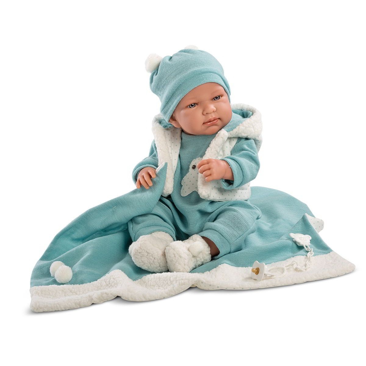 Lalka w całości jest wykonana z przyjemnego w dotyku winylu, natomiast ubranka zostały uszyte z wysokiej jakości materiałów. Kończyny oraz głowa poruszają się wokół własnej osi, a oczy są na stałe otwarte. Główkę naszej lali zdobi turkusowa czapeczka z pomponami. Tino ubrany jest w turkusowe śpioszki z uroczą naszywką w kształcie misia oraz cieplutką kamizelkę z kapturem i skarpetki zrobione z materiału imitującą owczą wełnę.